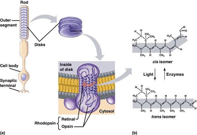 Dans l'obscurité le rétinal a une forme courbe, appelé cis-rétinal s'imbriquant dans l'opscine du photopigment. Quand le cis-rétinal absorbe un photon (unité fondamentale de la lumière), il se redresse et prend la forme trans-rétinal.