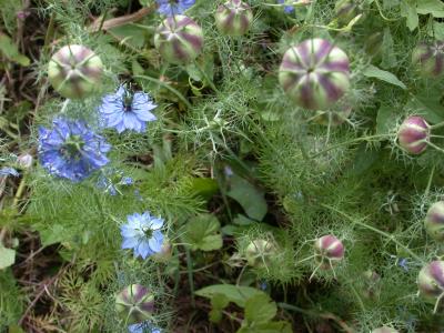 3. La nigelle de Damas (Nigella damascena L. 1753), communément appelée 'cheveux de Vénus', 'diable-dans-le-buisson' ou 'Belle-aux-cheveux-dénoués', est une plante annuelle de la famille des Ranunculaceae, de moyenne taille, à feuilles aux segments très fins et aux fleurs d'un bleu très clair, rarement blanchâtres. Elle se développe dans les champs, les terrains vagues et rocailleux, les bords de route. Les graines de la nigelle de Damas ? contrairement à celles de la nigelle cultivée ? seraient toxiques.