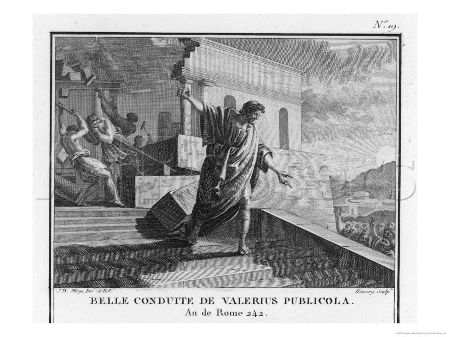 2. Il dépose ses faisceaux aux pieds du peuple [37], reconnaissant et honorant ainsi la souveraineté suprême du peuple, et ainsi il recouvre la confiance entière du peuple [33], et reçoit alors le surnom du Publicola, selon Plutarque [38], alors que Tite-Live et Aurelius Victor écrivent qu'il reçoit ce surnom après une série de lois favorables au peuple.