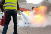 Après une alerte, le pompier d'aerodrome chef de manoeuvre a rapidement évalué la situation avant de donner ses ordres aux autres pompiers.