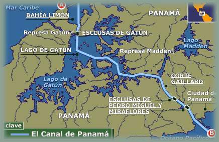 4. Le canal de Panama ( espagnol : canal de Panamá ) est un canal maritime de 80 km de long, qui traverse l'isthme de Panama en Amérique centrale, reliant l'océan Pacifique et l'océan Atlantique. Sa construction a été l'un des projets d'ingénierie les plus difficiles jamais entrepris. Son influence sur le commerce maritime a été considérable, puisque les navires n'ont plus eu besoin de faire route par le cap Horn et le passage de Drake, à la pointe australe de l'Amérique du Sud. Un navire allant de New York à San Francisco par le canal parcourt 9 500 kilomètres, moins de la moitié des 22 500 kilomètres du voyage par le cap Horn .