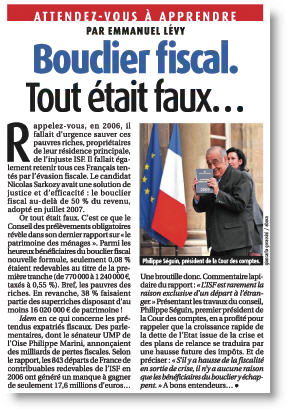 On peut discuter du bienfondé de ce bouclier fiscal et ne pas trouver anormal que personne n'ait à payer en impôts plus de 50% de ses revenus. Mais alors qu'on demande à tous les Français, au nom de la crise, de se serrer la ceinture, il est évidemment insupportable pour l'opinion d'apprendre que l'Etat a reversé 679 millions d'? aux 18.764 contribuables les plus riches du pays. Le mot même de « bouclier » est insupportable puisqu'on imagine alors des millionnaires et les milliardaires totalement à l'abri derrière ce bouclier pendant que les hausses des prélèvements obligatoires vont pleuvoir sur la plèbe.