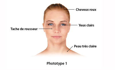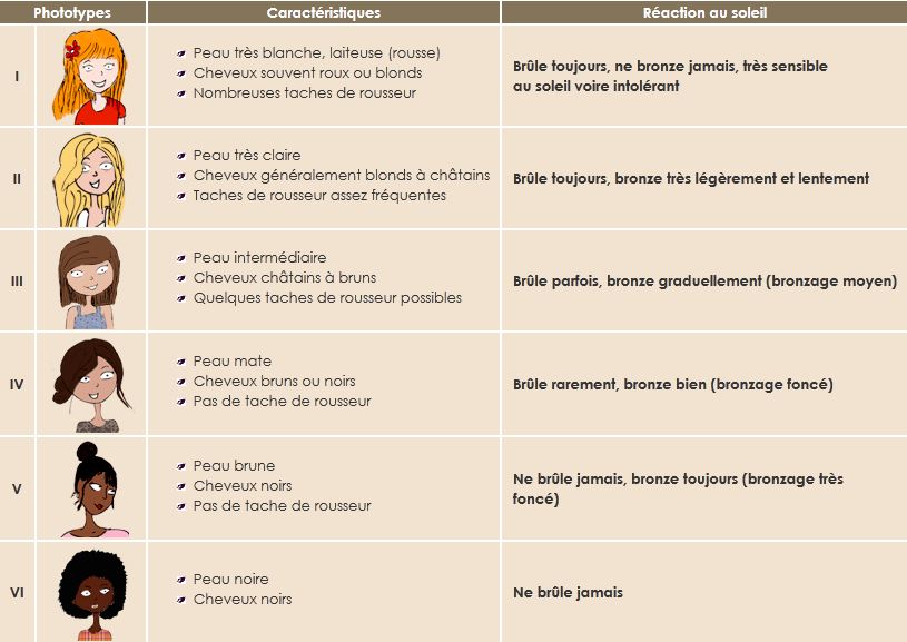 3. (Biologie) Type de peau en fonction de sa réaction au soleil, classé de 1 (peau très blanchâtre, tâche de rousseur, ne bronze pas, coup de soleil systématique) à 6 (peau noire, jamais de coup de soleil)
