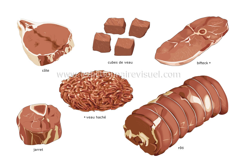 2. La viande de veau est issue de bovins juvéniles n'ayant pas plus de huit mois, par opposition à la viande de boeuf provenant de bovins plus âgés. Cette viande provient majoritairement de bovins de race laitière, et souvent de sexe mâle, une partie des jeunes femelles étant utilisées pour le renouvellement des troupeaux. Classée dans les viandes blanches, la viande de veau est généralement plus chère que la viande de boeuf.