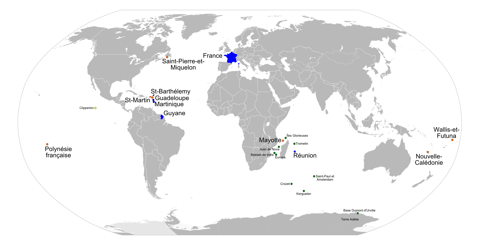 4. La France d'outre-mer ou les Outre-mer ou encore les outre-mers comprend les territoires de la République française éloignés de la France métropolitaine, située sur le continent européen. On parle aujourd'hui de DROM-COM (départements et régions d'outre-mer et collectivités d'outre-mer) anciennement nommés DOM-TOM (départements d'outre-mer et territoires d'outre-mer).