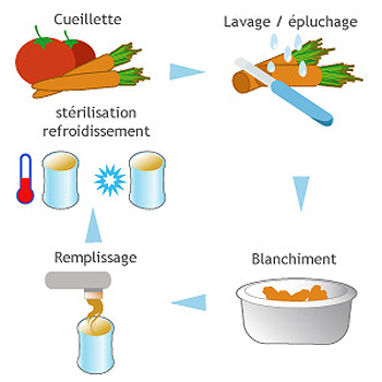2. Procédé de conservation des aliments par chauffage et protection dans un emballage hermétique à l'air.