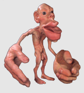 1. Représentation somatotopique motrice (prérolandique) et somesthésique (rétrorolandique) des diverses parties du corps telles qu'elles se projettent, selon leur importance physiologique respective, sur le cortex controlatéral des circonvolutions frontale et pariétale ascendante (W.Penfield). [Dictionnaire médical de l'Académie de Médecine]