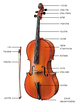3. Le violoncelle est un instrument à cordes frottées (mises en vibration par l'action de l'archet) ou pincées (le pizzicato) de la famille des cordes frottées, qui compte aussi le violon, l'alto et la contrebasse. Il se joue assis et tenu entre les jambes ; il repose maintenant sur une pique escamotable, mais fut longtemps joué posé entre les jambes, sur les mollets ou sur la poitrine.