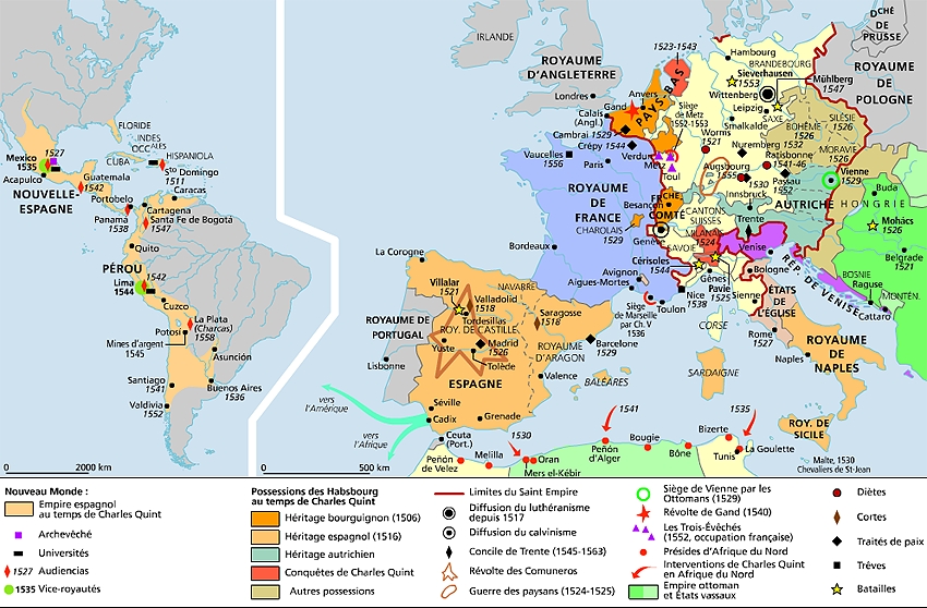 4. Charles de Habsbourg ou Charles V , couramment Charles Quint , né le 24 février 1500 à Gand (comté de Flandre) et mort le 21 septembre 1558 au monastère de Yuste (Espagne), fils de Philippe le Beau et de Jeanne la Folle, héritier par son père des possessions de la maison de Habsbourg (royaume de Hongrie, royaume de Bohême, archiduché d'Autriche, etc.), des dix-sept provinces des Pays-Bas et de la Franche-Comté, par sa mère des royaumes de Castille et d'Aragon et de l'empire colonial espagnol, ainsi que du royaume de Naples, élu empereur d'Allemagne en 1519, est le monarque le plus puissant de la première moitié du XVIe siècle.