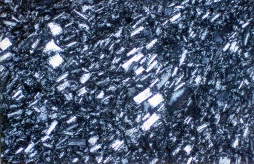 4. (Géologie) Roche volcanique caractérisée par une texture microlithique avec présence de grands cristaux, majoritairement composée de feldspath alcalin dans une matrice grise et rugueuse.