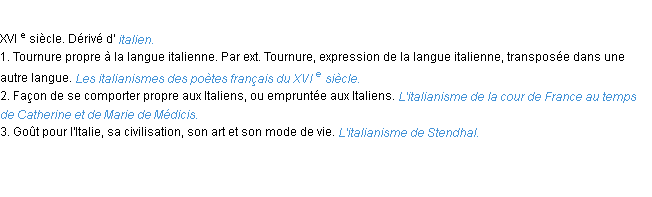 3. Un italianisme est un tour, mot ou usage propre à la langue italienne transposés dans une autre langue.