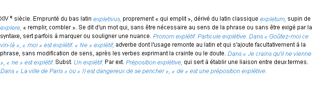 Particule explétive : Petit mot ou partie de mot qui s'ajoute à un autre mot sans en changer la signification et qui était en usage fréquent dans les langues grecque et latine. On en trouve quelques exemples en français ; ainsi on dit Non pas ! et Oui-da !