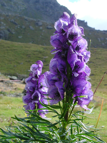 2. Aconitum, du grec ancien ????????, ou aconit, est un genre de plantes herbacées, les aconits, de la famille des Ranunculaceae. Ce sont, pour un certain nombre, des espèces montagnardes. Leurs fleurs semblent coiffées d'un casque. Elles contiennent des alcaloïdes toxiques, dont l'aconitine, poison mortel pour les humains et pour de nombreux animaux.