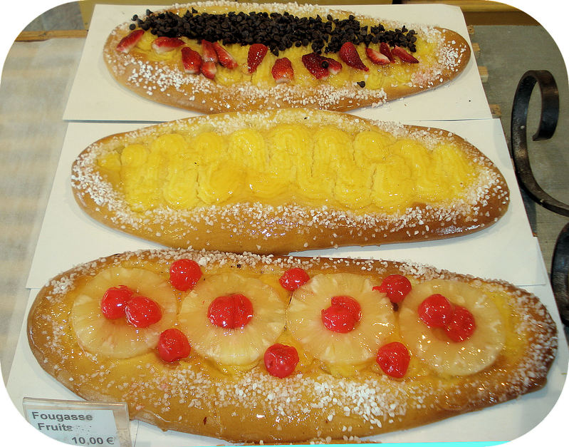 9. La fougasse Écouter, ou fougace, est un pain provençal à croûte molle, à mie épaisse et moelleuse, réalisé à partir de farine blanche ou bise, de levure de boulanger et d'huile d'olive, pouvant être légèrement sucré ou agrémenté d'oignons, d'olives noires, d'anchois et de lardons. Il existe aussi la fougasse au sucre dans les Alpes du Sud ou à Aigues-Mortes (Gard).