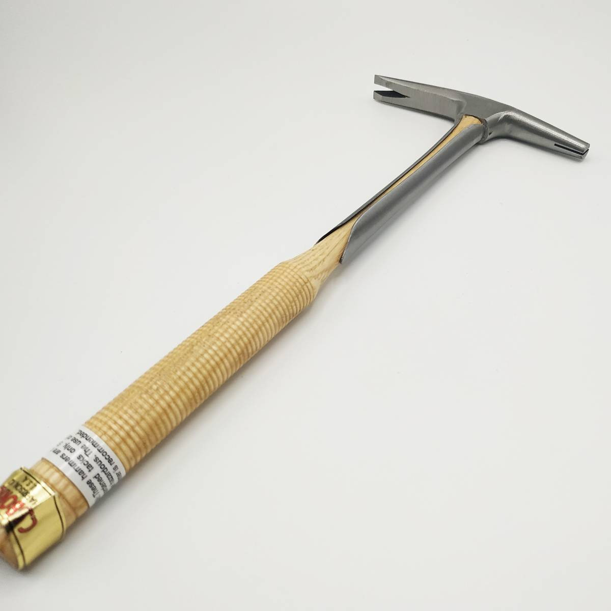 8. Marteau de tapissier à manche en bois dont le fer comporte 2 parties utiles de forme allongée et étroite, adaptées aux clous à enfoncer et dont la tête est recouverte de cuivre, afin de ne pas bosseler la fragile tête des clous de tapissier et des semences.